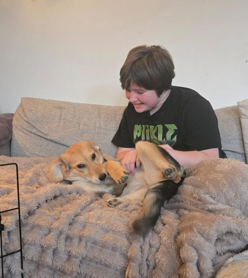 Cranberry loves to play with toys, other dogs and people! She enjoys a snooze at your side but equally happy to settle in her bed. Shes had plenty of visitors and has been happy to see them all, she gets on with her foster siblings and plays well, learning from them. Cranberry is a sweet puppy with big soft ears, a happy waggy tail and a puppy bounce that brightens your day.